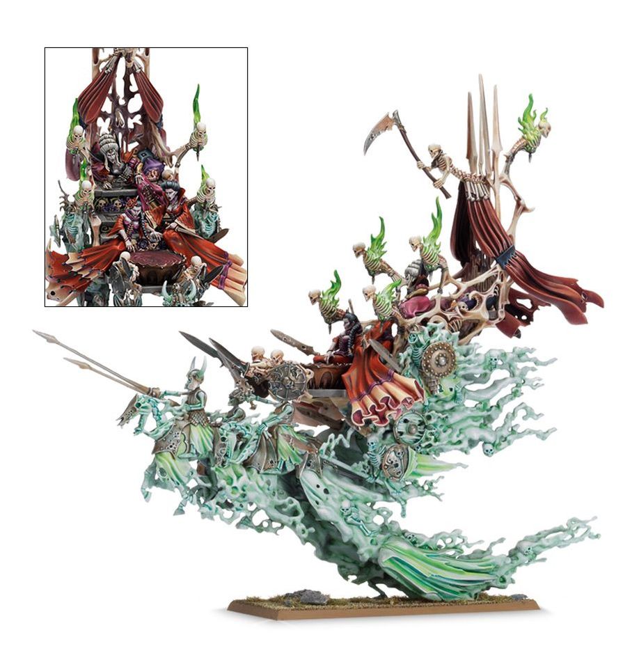 The Coven Throne is a huge model whose lower half is made up of ethereal madness. Ghostly, and occasionally armoured, tendrils stretch upward at an angle, at the head of which are skeletal riders on armoured horses. At the centre, it features the seductive Vampire and her handmaidens looming over a cauldron of blood. The kit is bedecked with a mind-boggling range of features, from lanterns to skeletons, to ghostly winds, decadent cushions and magical flames.